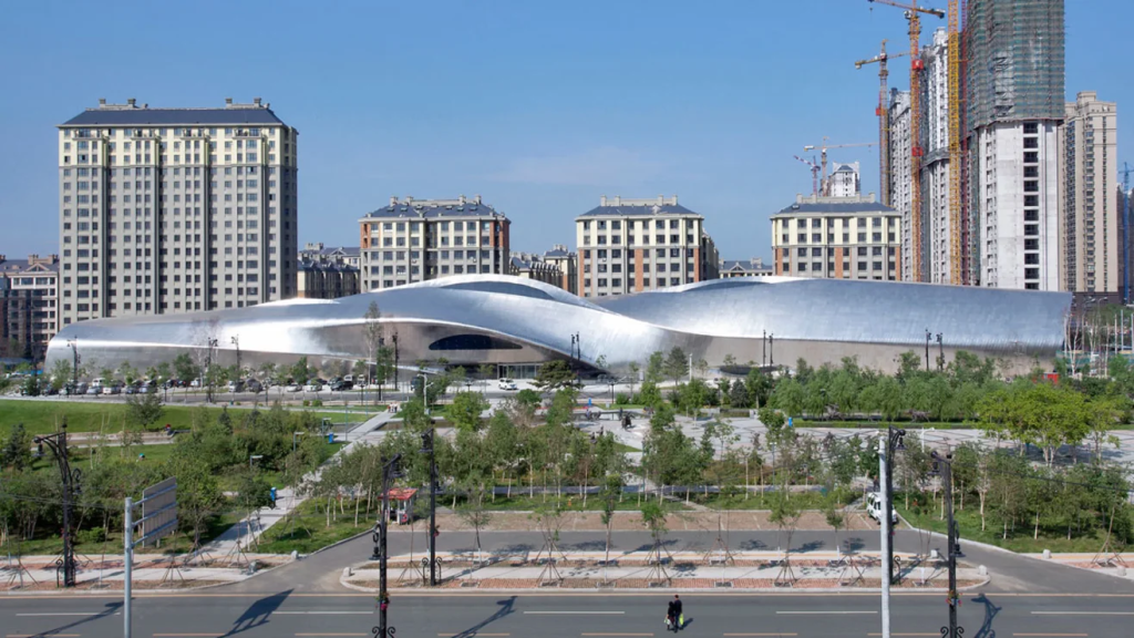 El Museo de Escultura en Madera de China irrumpe en el paisaje de la ciudad norteña de Harbin. Su edificio retorcido, de 200 metros de longitud, se inspira en carámbanos, en sintonía con el clima gélido de la ciudad.