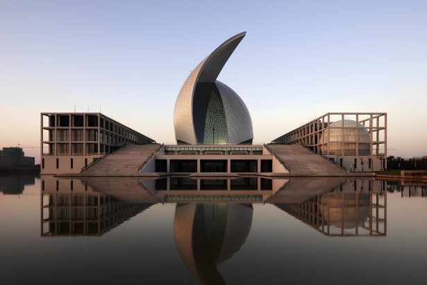 El Museo de Ordos, en Mongolia Interior, diseñado por MAD Architects. El volumen futurista ancla la nueva ciudad construida en pleno desierto y está revestido con placas metálicas pulidas que lo protegen de las frecuentes tormentas de arena.