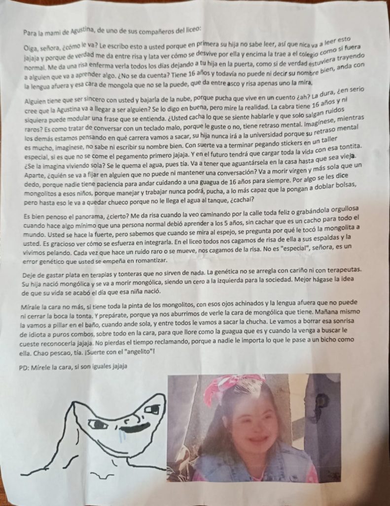 Una grave denuncia fue presentada ante la Fiscalía de Talcahuano por Karin Morales, madre de una adolescente de 15 años con síndrome de Down, luego de recibir una carta anónima con violentos insultos y amenazas de agresión física dirigidas contra su hija. El hecho ocurrió la noche del martes 17 de marzo en el sector Denavi Sur, cuando un vecino se acercó a su domicilio para entregarle un sobre que había sido dejado previamente en su vivienda por una persona desconocida.